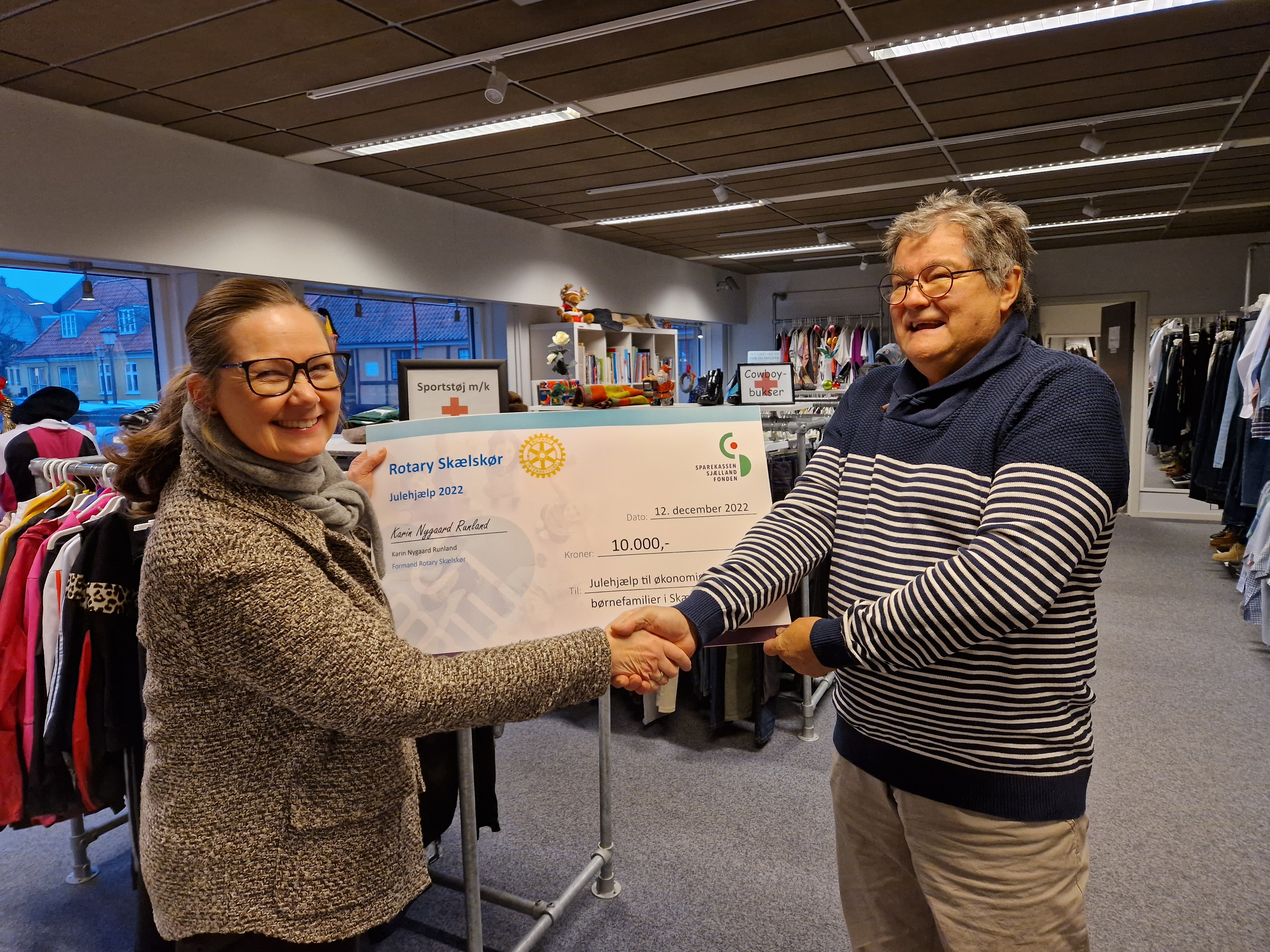 Rotary Skælskør gav en julecheck på 10.000 kr. til Røde Kors i Skælskør, som har stået for modtagelse af ansøgninger om julehjælp i år.
