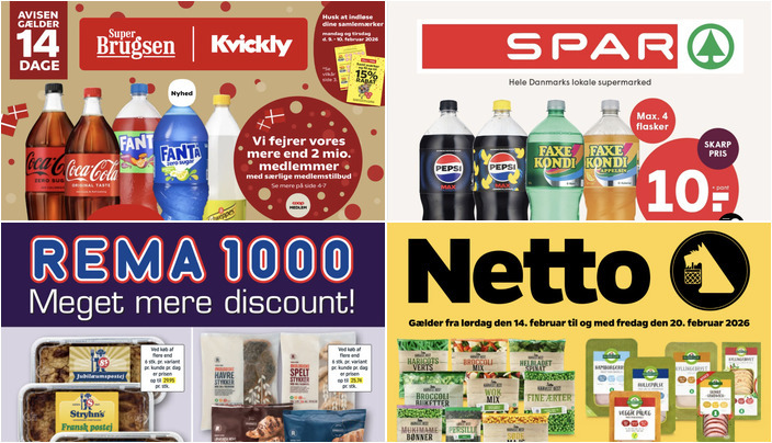 Rema 1000 tilbyder Coca-Cola, Fanta, Tuborg Squash eller Schweppes i forskellige varianter til kun 12 kr. pr. flaske. Tilbuddet gælder fra søndag den 15. februar til lørdag den 21. februar.